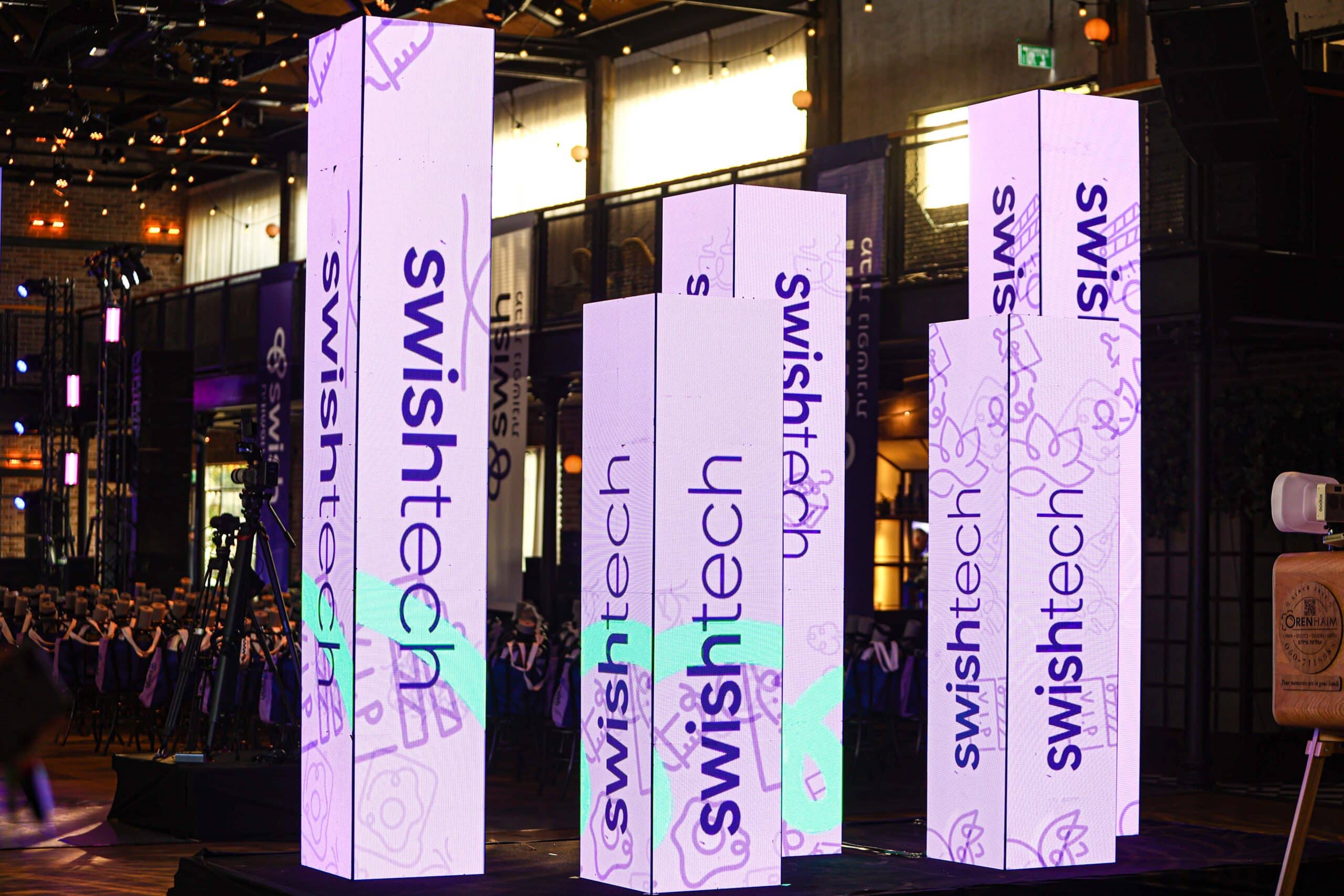 במסגרת הפרויקט יצרנו אייטם פתיחה ייעודי בסגנון Don’t Blink, שפיתח שפה טיפוגרפית וקצבית בהתאם לסיפור המותג של Swish – מצגת תוכן מדויקת להנחיה, לוגו נושם לאנימציות המסכים, ואריזה גרפית מלאה לכל מערך הווידאו וה־LED באירוע.