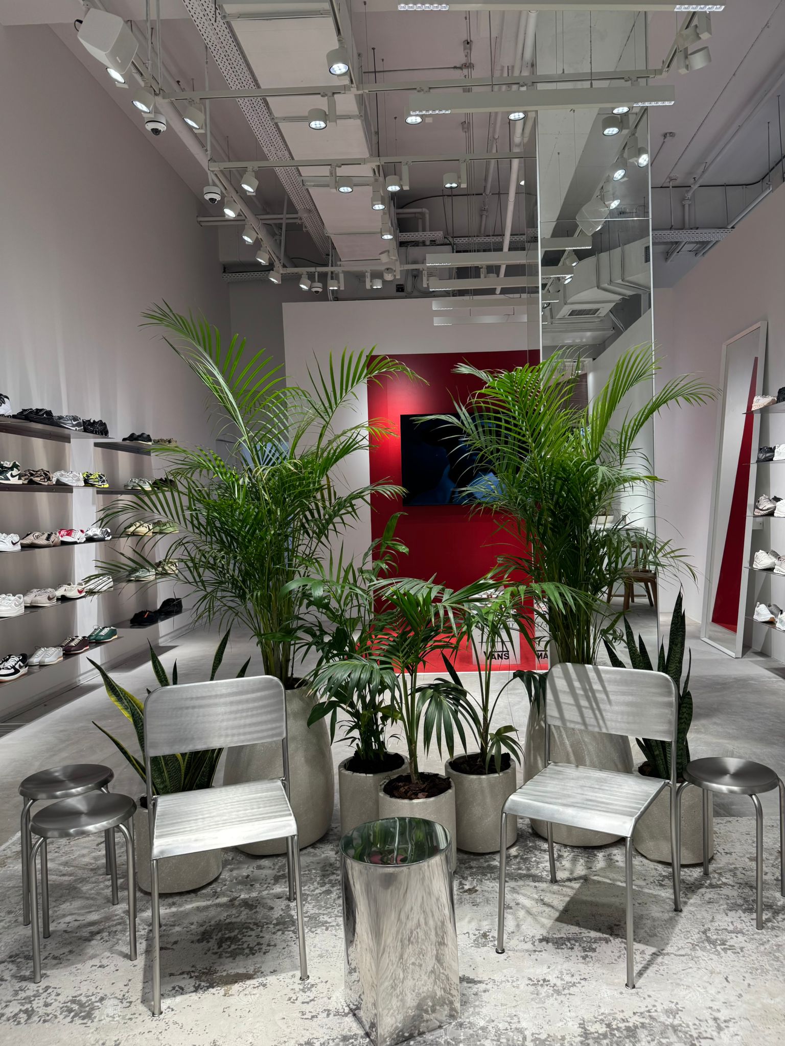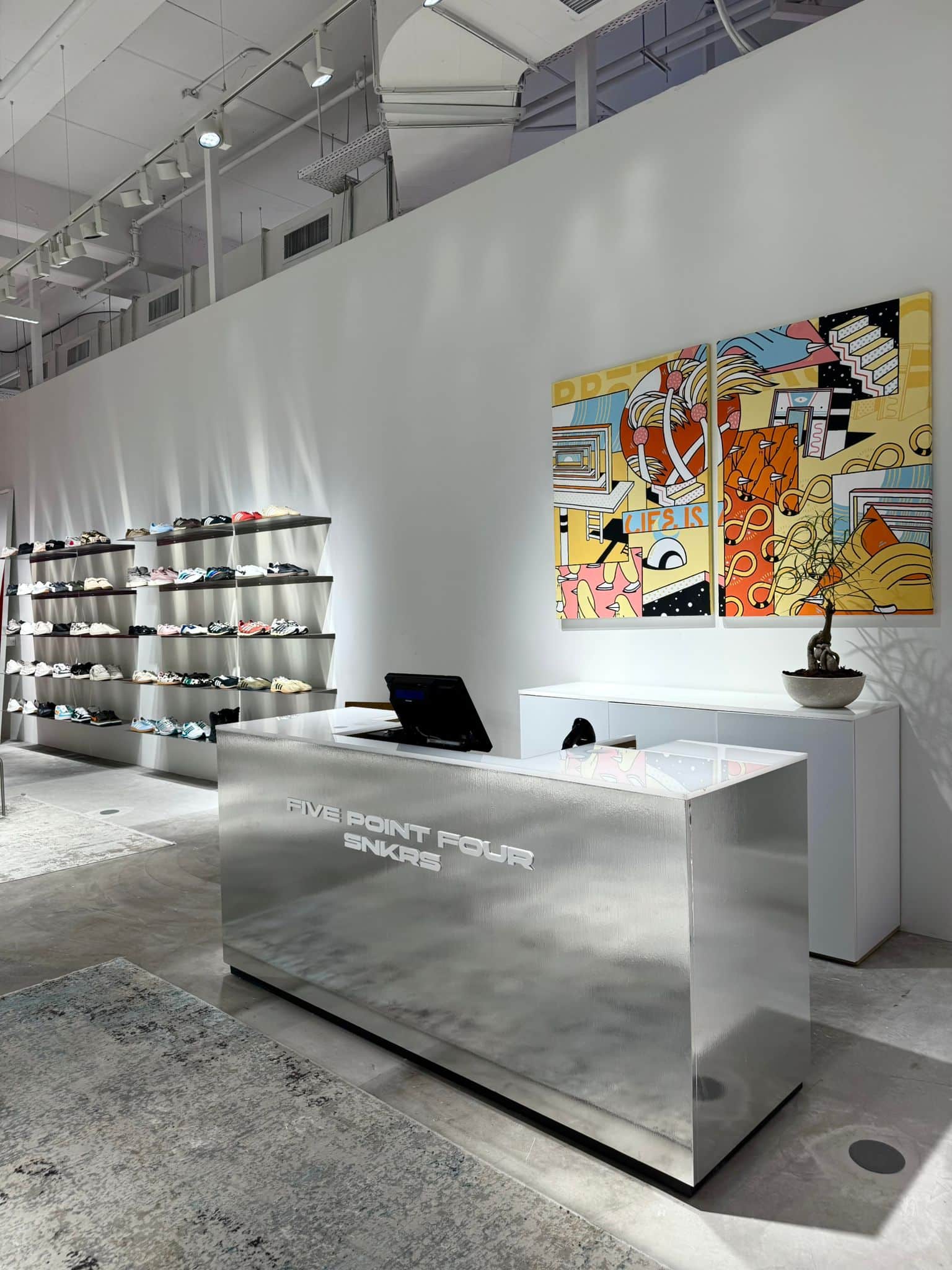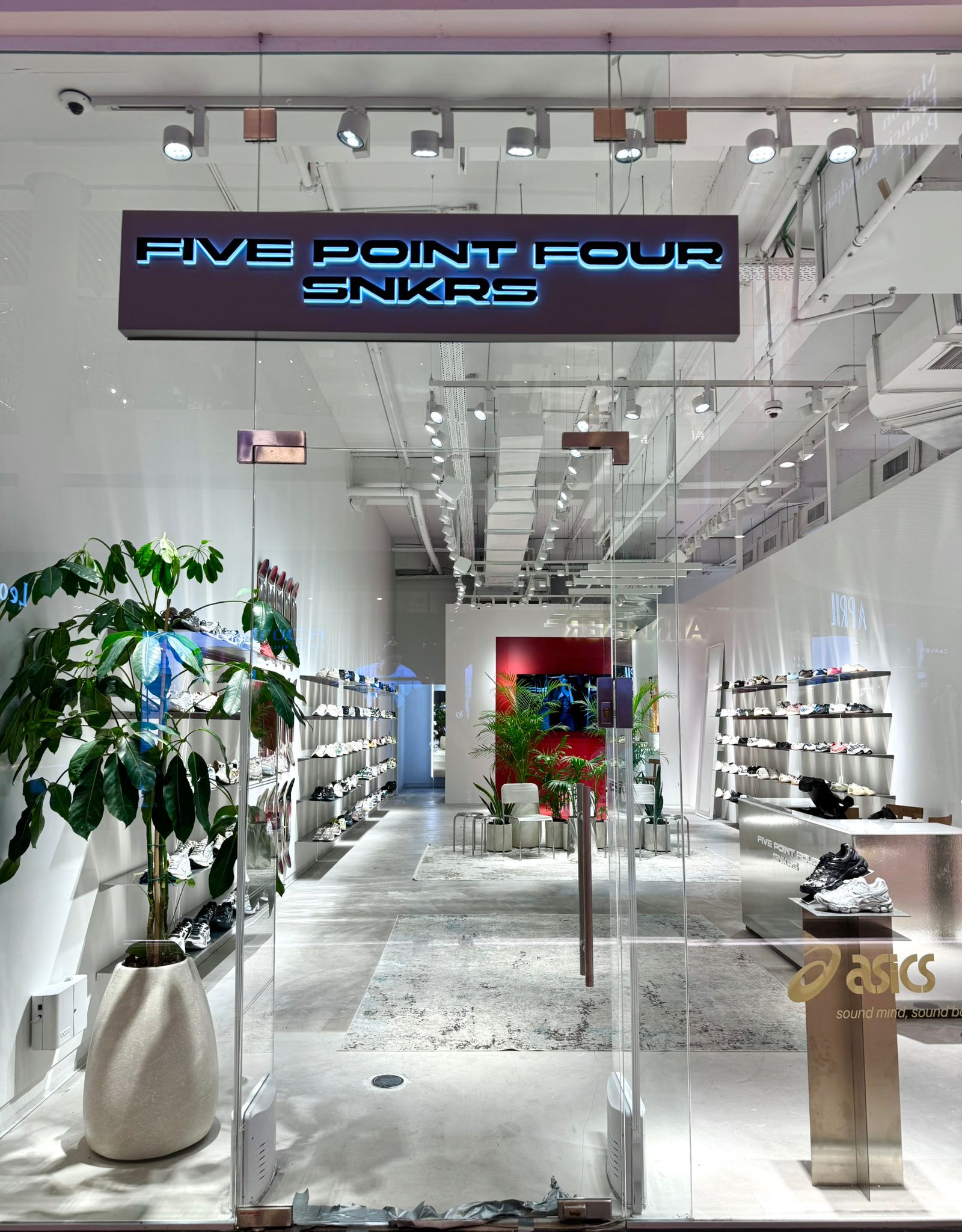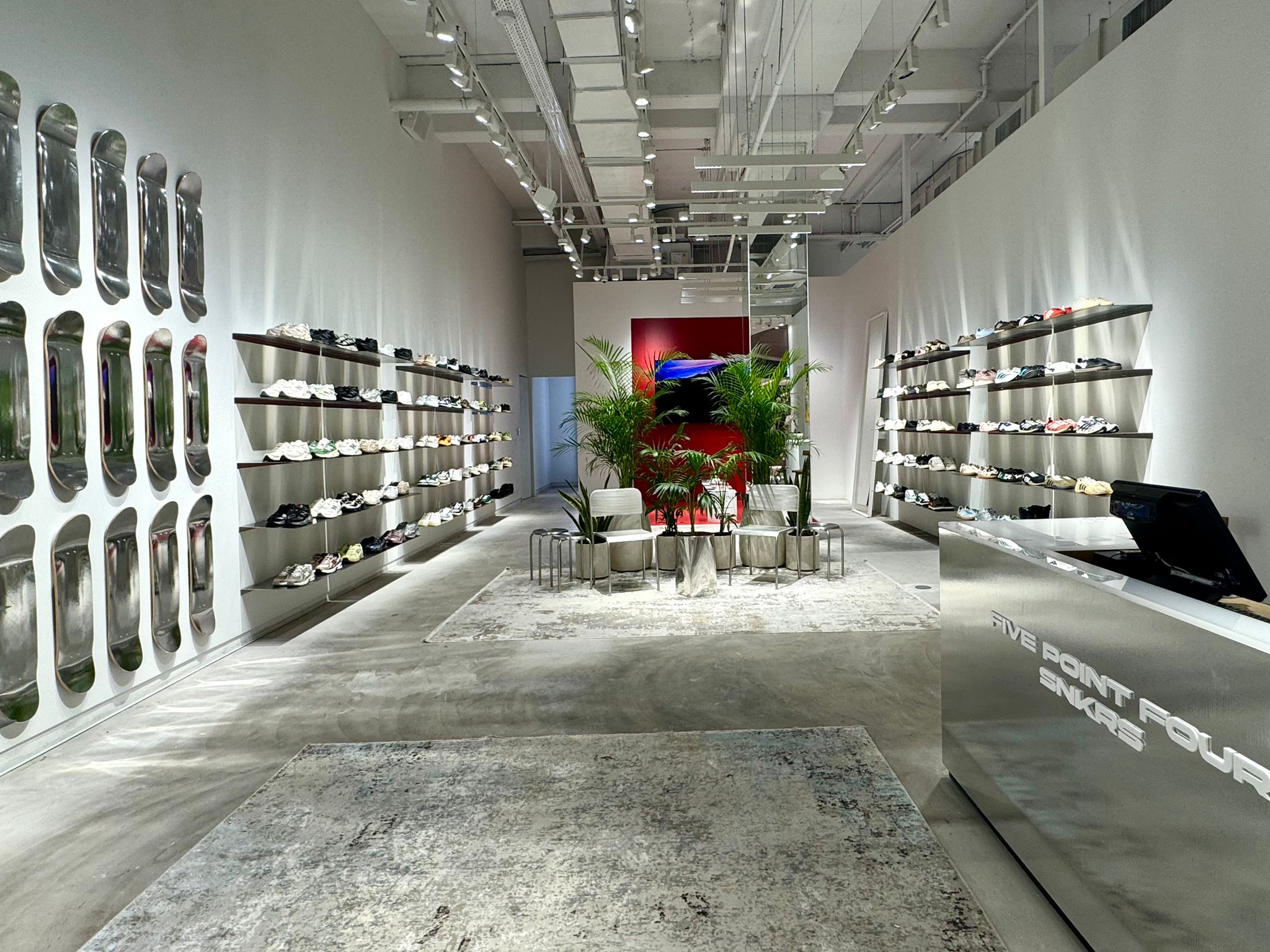 מדפי נירוסטה שימשו כאלמנט עיצובי מרכזי ויצרו מעטפת אחידה ומרשימה לחנות של פקטורי 54 בקניון רמת אביב של מותג הנעליים Five Point Four. קוביות נירוסטה שימשו במות מוצר והשלימו את המראה הייחודי של החנות, שעוצבה באווירה תעשייתית, צעירה וחדשנית.